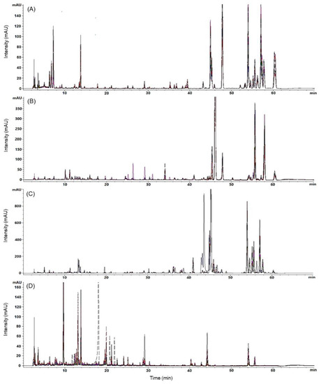 Overlapping chromatograms of representative samples of Peucedanum japonicum ((A) PJ01–10), P. praeruptorum ((B) PP01–10), Angelica decursiva ((C) AD01–07), and Saposhnikovia divaricata ((D) SD01–10) at a detection wavelength of 325 nm.