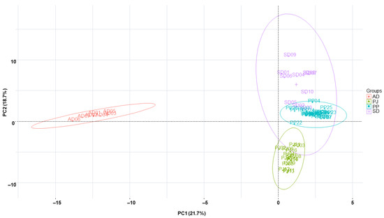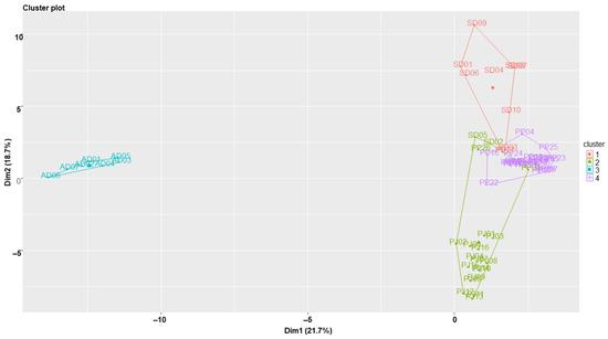 In the k-means clustering analysis, four clusters were selected as the optimal number of clusters, which was determined using the silhouette method (Figure S3). The distribution of samples according to their dimension scores was consistent with those in the PC plot. However, the grouping of samples was different, as follows: PP01, PP26, SD02, and SD05 samples were contained in the PJ cluster and PP27 was contained in the SD cluster. Hence, the PJ cluster was intruded by the PP cluster which also slightly overlapped with the SD cluster. The AD cluster also showed a distinct distance from the other clusters, as shown in the PC plot (Figure 4).