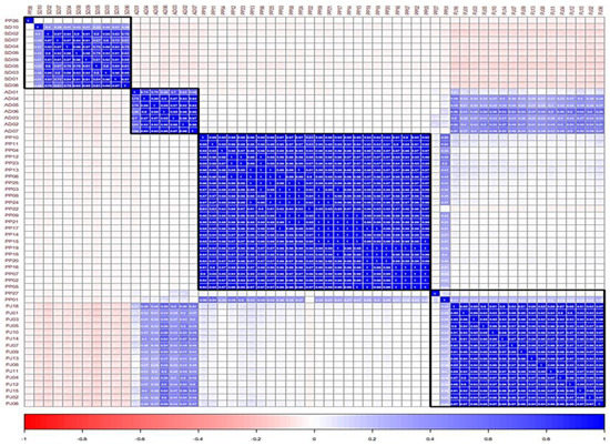 The similarity among the PJ, PP, AD, and SD samples was evaluated using Pearson’s correlation coefficient (r), which ranged from −1 to +1 (Table S4). In the correlation plot, the PJ samples showed a higher correlation with the AD samples (r = 0.791 for mean and 0.976 for median), followed by most PP samples (r = 0.029 for mean and 0.021 for median), and were negatively correlated with the SD samples (r = −0.099 for mean and −0.097 for median). The correlations between the PP and AD samples (r = −0.011 for mean and −0.014 for median), PP and SD samples (r = −0.038 for mean and median), and AD and SD samples (r = −0.061 for mean and −0.060 for median) were not different. The mean and median r values also showed that the intra-species relationships were as follows: PJ–PJ > PP–PP = AD–AD > SD–SD. Meanwhile, inter-species relationships were as follows: PJ–AD > PJ–PP > PP–AD > PP–SD > AD × SD > PJ–SD (Figure 5 and Table 4).