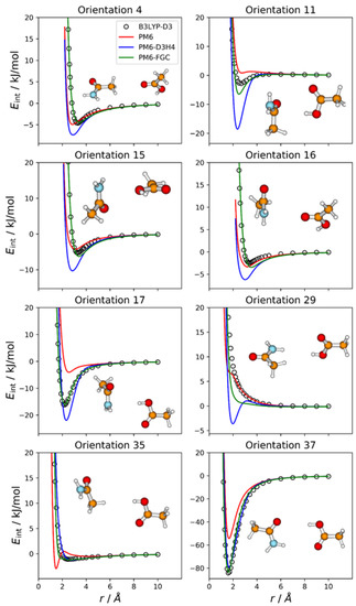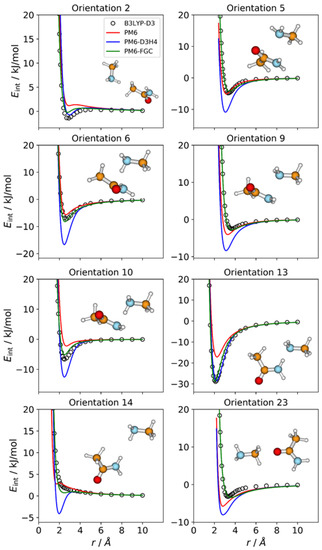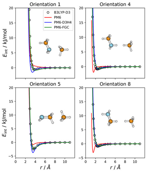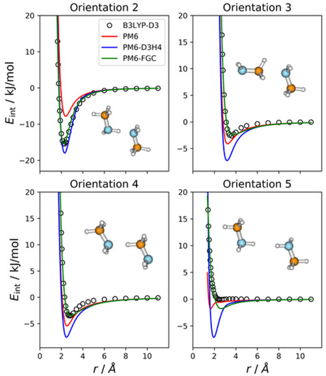 In general, for the 11 orientations considered here, the performance of our method is quite good and the improvement over the PM6 and PM6-D3H4 is clear. This may be quantified by the values of the mean absolute errors (MAEs), which are collected in Table S1 in the Supplementary Materials. For interaction energies below 5 kJ/mol, the calculated MAEs are 1.65 kJ/mol (PM6), 1.32 kJ/mol (PM6-D3H4), and 0.34 kJ/mol (PM6-FGC). Increasing the maximum interaction energy up to 20 kJ/mol, we obtained 2.69 kJ/mol (PM6), 2.27 kJ/mol (PM6-D3H4), and 0.38 kJ/mol (PM6-FGC). The significant increase in the PM6 and PM6-D3H4 MAEs, obtained by increasing the range of the interaction energies, indicates that the accuracy of these methods for the repulsive region of the intermolecular potential is very low, as could be anticipated by close inspection of Figure 2 and Figure S1. The performance of the PM6-FGC is quite good, even up to interaction energies around 100 kJ/mol; at this energy, the calculated MAEs are 4.79 kJ/mol (PM6), 5.15 kJ/mol (PM6-D3H4), and 0.41 kJ/mol (PM6-FGC). For higher repulsive energies, the PM6-FGC may fail dramatically with the present corrections, although the development of specific corrections for high interaction energies is straightforward. For most practical applications, however, the attractive region of the potential energy is the important one.