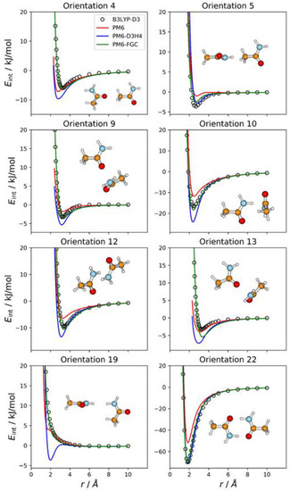 For acetamide, we defined five different atom types, as shown in Figure 1. Consequently, the dimer has 21 different types of pairwise interactions. For the fits, we considered 22 orientations. The additional one (i.e., orientation 22) corresponds to the most stable conformation of the dimer. For this orientation, we performed a full optimization at the B3LYP-D3/def2-TZVP level. Then, we calculated the associated IPEC by varying one of the O⋯H distances along the direction defined by these two atoms. In Figure 3, we display eight selected orientations with the corresponding IPECs. The IPECs of the remaining orientations are shown in Figure S2 of the Supplementary Materials. For the most stable configuration of the dimer, both corrected methods reproduce the reference IPEC very well. The interaction energy at the minimum is about −70 kJ/mol. The underestimation of the hydrogen bonding interaction by the PM6 method is apparent in the figure.