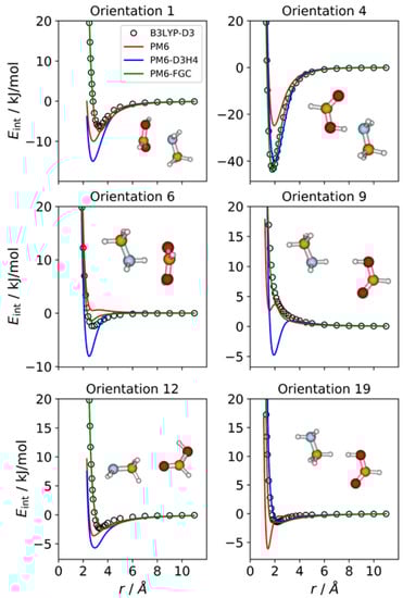For this complex, we considered 20 different orientations, which is the number of different types of pairwise interactions exhibited in this system. In Figure 6, we display the IPECs for six orientations of this complex. The remaining 14 orientations are depicted in Figure S6 of the Supplementary Materials. Orientation 4 shows the strongest attractive interaction, as expected, since it leads to hydrogen bonding between the carboxylic hydrogen and the amine nitrogen. The well depth calculated at the B3LYP-D3/def2-TZVP level is 43.5 kJ/mol, with the minimum being at an H⋯N distance of 1.8 Å. In general, the performance of the PM6-FGC is quite good; the most significant deviations from the reference curves, for example, those occurring for orientations 6 and 19, are rather small.