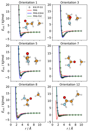 This complex shows 12 different types of pairwise interactions. Accordingly, we considered 12 orientations, selected in such a way that they emphasize the different pair interactions. The IPECs for six of these orientations are exhibited in Figure 7; the IPECs of the remaining orientations are shown in Figure S7 of the Supplementary Materials. As for the CH3NH2–CH4 complex, both corrected methods afford results in good or reasonably good agreement with the reference IPECs. The improvement of PM6-FGC over the PM6-D3H4 method is reflected in the values of the calculated MAEs (Table S1). Considering all the orientations and interaction energies below 5 kJ/mol, the MAE of our method (0.15 kJ/mol) is four times smaller than that of the PM6-D3H4 method (0.61 kJ/mol).