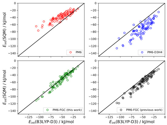 As described in our previous study [21], for the dialanine dimer we obtained 90 different conformers. For these conformers, the interaction energies were evaluated by single-point B3LYP-D3/def2-TZVP calculations, using counterpoise corrections, and the data were used to compute linear correlations with the corresponding SQM values. The results are shown graphically in Figure 9. The black straight lines correspond to the case of perfect correlation. In addition, in seen in Table 2, we collected the calculated MAEs, as well as the mean bias errors (MBEs). The MBE is just the mean value of the differences between the reference and the model prediction (i.e., the SQM results). A positive MBE value indicates that the SQM method overestimates the strength of the interaction whereas a negative value indicates underestimation. As can be seen from the figure and the statistical values given in Table 2, our approach provides an improvement in the accuracy of SQM methods for the calculation of noncovalent interactions in this system. The MAE and MBE values calculated for PM6 and PM6-D3H4 are much larger than those computed for our method, using either the present or the previous corrections. The MAE calculated for the data obtained with the present corrections (4.9 kJ/mol) is significantly smaller than that determined in our previous study (8.7 kJ/mol). To a large extent, this is a consequence of the very small bias displayed by the interaction energies calculated with the present corrections.