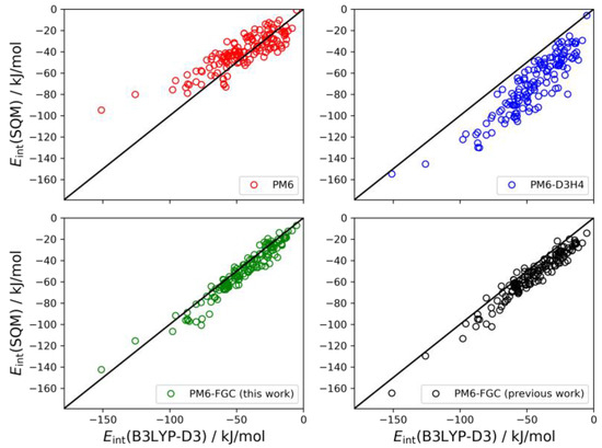Very recently, we developed the PM6 Functional Group Corrections (PM6-FGC) approach [21] to correct the semiempirical PM6 Hamiltonian and improve the description of noncovalent interactions. Although in general, the subsequent PM7 method [22] provides higher accuracy than its predecessor, we used the PM6 Hamiltonian, following Grimme and co-workers’ recommendation [23]. Specifically, they reported significant errors in interaction energies calculated with PM7 for large systems, due to the damping and truncation of the dispersion energy at long range in this Hamiltonian [24,25]. Our previous work [21], presented as a proof-of-concept study, provides an alternative way to obtain analytical corrections for SQM methods. The improvement of the description of noncovalent interactions in SQM methods is particularly important in quantum mechanics/molecular mechanics (QM/MM) simulations, since the efficiency of the quantum mechanical method is crucial for practical applications. Furthermore, the use of a semiempirical Hamiltonian may be convenient for investigating chemical reactions because the semiempirical parameters may be specifically adjusted for individual reactions [26].