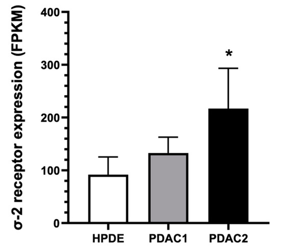 Two primary pancreatic cancer cell cultures (PDAC-1 and PDAC-2) originated from patients undergoing surgical resection for PDAC showed significantly higher mRNA expression levels of the σ2 receptor compared to HPDE cells. Columns represent the mean values obtained from three independent experiments; bars represent the SD. * p < 0.05 compared to HPDE cells.