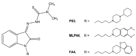 Chemical structures of the thiosemicarbazones (MLP44, PS3, and FA4) targeting the σ2 receptor.