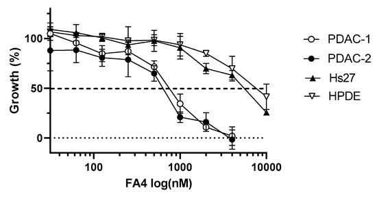 Representative dose-dependent inhibition of cell growth by FA4 in the PDAC primary cell lines PDAC-1 and PDAC-2 and in the HPDE and Hs27 cells. Cell viability was determined using the SRB assay after 72 h of treatment with increasing concentrations of FA4. Data points represent mean percentage of cell growth ± SD of three independent experiments.