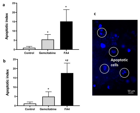 Effects of FA4, on apoptosis induction in PDAC-1 (a) and PDAC-2 (b) pancreatic cancer cells. The apoptotic index was calculated by evaluating the annexinV-FITC fold change compared to control cells after 24 h treatment. Gemcitabine was used as a positive control. Columns represent the mean; bars represent the SD. (c) Representative pictures of PDAC-2 cells with apoptotic features as assessed by bisbenzimide staining after treatment with FA4. * p < 0.05, significantly different compared with control; # p < 0.05, significantly different compared with gemcitabine.