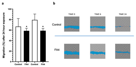 Results of the migration assay performed by incubating confluent cells after the scratch with FA4 10 µM in the PDAC-1 and PDAC-2 cells (a), and representative pictures taken at different time points (0, 6, and 24 h) in PDAC-2 cells (b). Data are derived from three independent experiments. Columns represent the mean values obtained from three independent experiments in treated and untreated (control) cells; bars represent the SD; asterisks indicate the statistical significance compared to the control. * p < 0.05.