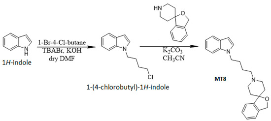 According to a previously reported procedure [17], the synthesis of compound MT8 was obtained by nucleophilic substitution of the spiropiperidine system on the 1-(4-chlorobutyl)-1H-indole portion (Scheme 1).