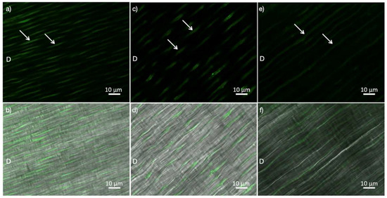 Dentin slices derived from all groups that were incubated with quenched fluorescein-labeled gelatin (D). In-situ zymographic assay showed similar enzymatic activity between the investigated groups. (a) Image acquired in the green channel, showing fluorescence (identifying medium level of endogenous enzymatic activity) in dentinal tubules induced with 35% HP treatment. (b) Image of 35% HP group, obtained by merging the differential interference contrast (DIC) image and the image acquired in the green channel. (c) Image acquired in the green channel, showing fluorescence (identifying medium level of endogenous enzymatic activity) in dentinal tubules induced with 10% CP treatment. (d) Image of 10% CP group, obtained by merging the DIC image and the image acquired in the green channel. (e) Image acquired in the green channel, showing fluorescence (identifying medium level of endogenous enzymatic activity) in dentinal tubules with no treatment (control group). (f) Image of the control group, obtained by merging the DIC image and the image acquired in the green channel. Arrows show enzymatic activity. HP: hydrogen peroxide, CP: carbamide peroxide.