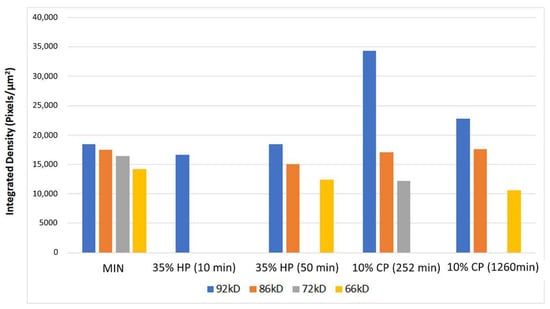 The zymograms of gelatinolytic activity are shown in Figure 3. The band of mineralized sound dentin showed the pro-forms and active-forms of MMP-2 and -9 (72/66 and 92/86 kDa, respectively). The expression of MMP-9 remained similar to the control group after the bleaching treatment with 35% HP in both exposure times. On the other hand, the expression of the pro-form of MMP-9 increased markedly in the 10% CP groups, especially after the protocol of 252 min, which presented a more intense band. The expression of the pro-and active-forms of MMP-2 decreased in all the tested groups, with a complete inhibition in the 35% HP groups and a lower expression in the 10% CP groups, especially in the protocol of the 1260 min application (Figure 4).