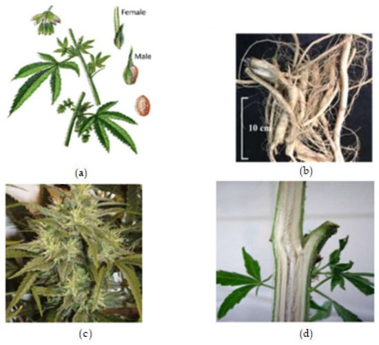 Cannabis plant parts. (a) Male and female Cannabis flowering parts with fresh leaf and seed. (b) Fresh Cannabis root. (c) Fresh Cannabis inflorescence (flower). (d) Fresh Cannabis stem bark.