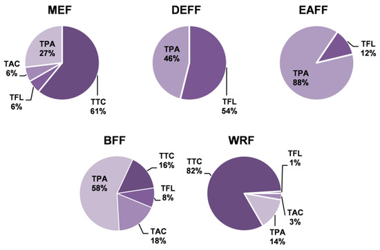 The quantitative profiles of the fruit extracts/fractions differed depending on the extraction solvent (Table 1). The total phenolic content varied in the range of 64.6–126.5 mg GAE/g dw (TPC, determined by the Folin–Ciocalteu method) and 6.1–104.0 mg/g dw (TPH, determined by HPLC-PDA) with the highest values observed for DEFF and EAFF fractions. In all extracts/fractions, the TPC levels surpassed the TPH values, which represent the sum of low-molecular-weight polyphenols, including total flavonoids (TFL), total anthocyanins (TAC) and total phenolic acids (TPA). This gap came primarily from the presence of high-molecular-weight tannin-type proanthocyanidins (TTC). Figure 2 presents the relative ratio of particular families of polyphenols to the TPH+TTC levels that reflect the actual total phenolic level of the blackthorn extracts. The results indicated that the main constituents of MEF (Table 1, Figure 2) and thereby the primary polyphenols of fresh fruits (Table S2) were tannins, followed by phenolic acids, anthocyanins and flavonoids. Partitioning of MEF between solvents of different polarities led to the concentration of anthocyanins in BFF, flavonoids mainly in DEFF, phenolic acids in DEFF, EAFF and BFF, and tannins in WRF.