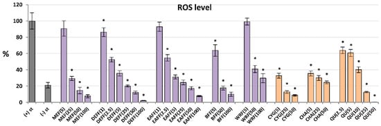 For antioxidant activity testing, ROS were produced by cells after stimulation by fMLP. As shown in Figure 3, all analysed extracts/fractions revealed significant and dose-dependent antioxidant effects and reduced the oxidative burst in stimulated human neutrophils by at least 70% at 100 μg/mL. The most potent activity was observed for fractions enriched in phenolic acids and flavonoids (DEFF and EAFF), which downregulated the ROS release by at least 93% at 100 μg/mL and 43% at 2.5 μg/mL. The source extract MEFF effectively inhibited the ROS production at the levels 25–100 μg/mL (p < 0.05). For instance, at 50 μg/mL, it reduced the ROS release to 15%. This allowed for reaching the physiological value of ROS generation, which in non-stimulated cells was 21%. Among the reference compounds, the strongest antioxidant effects were revealed for CYG and chlorogenic acid (CHA), followed by QU (a positive standard), which downregulated the ROS production already at 5 μM (1.5–2.5 μg/mL).
