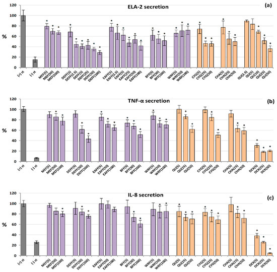 Effect of fruit extracts/fractions (1–100 µg/mL) and standards (5–50 µM) on pro-inflammatory functions of stimulated human neutrophils: effects on the release of (a) ELA-2, neutrophils elastase; (b) TNF-α, tumour necrosis factor α; and (c) IL-8, interleukin 8. Positive controls: QU, quercetin; DEX, dexamethasone. For extracts codes see Table 1. Data expressed as means ± SD of five independent experiments performed with cells isolated from five independent donors. Statistical significance in Dunnett’s test: * p < 0.05 compared with the stimulated control.