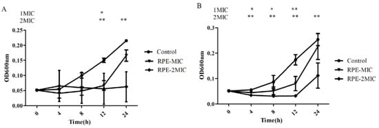 Time-killing curve of RPE against S. aureus (A) and MRSA (B). (A) The time growth curve of RPE against S. aureus. (B) The time growth curve of RPE against MRSA. All data are presented as mean values ± SD, and n = 3 in each group. * p < 0.05, ** p < 0.01, vs. the solvent control.