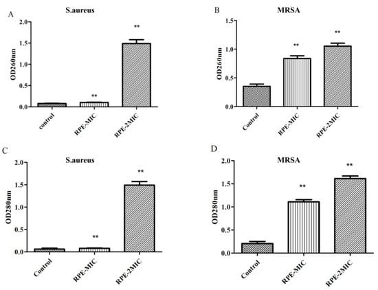260 nm absorbance values of S. aureus (A) and MRSA (B) treated with RPE, and 280 nm absorbance from S. aureus (C) and MRSA (D) treated with RPE. All data are presented as mean values ± SD, and n = 3 in each group. ** p < 0.01, vs. the solvent control.