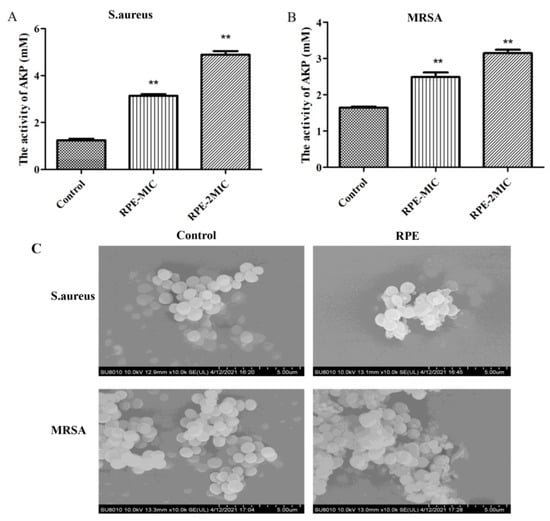 Assessment of leakage of AKP from (A) S. aureus and (B) MRSA treated with RPE; and (C) scanning electron micrographs of S. aureus and MRSA treated with RPE. Scanning electron micrographs show cell wall integrity of S. aureus: (left) S. aureus control (magnification × 100,000); (right) S. aureus treated with the RPE at 100 µg/mL (magnification × 100,000); Scanning electron micrographs showing cell wall integrity of MRSA: (left) MRSA control (magnification × 100,000); (right) MRSA treated with the RPE at 100 µg/mL (magnification × 100,000). All data are presented as mean values ± SD, and n = 3 in each group. ** p < 0.01, vs. the solvent control.