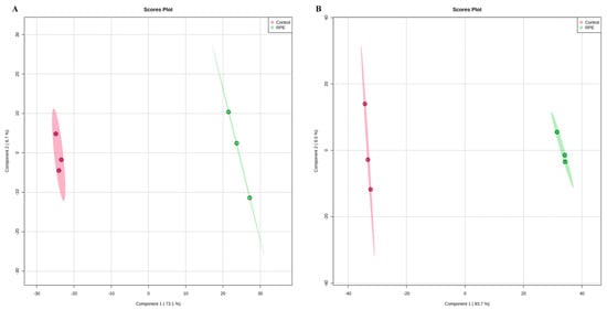 OPLS-DA spot of RPE treated on S. aureus and MRSA compared with untreated respectively. (A) OPLS-DA analysis of effects of RPE treatment of S. aureus relative to control. Each point represents a duplicate sample in each group (n = 3). (B) OPLS-D analysis of effects of RPE treatment of MRSA versus control. Each dot in the figure represents a duplicate sample in each group (n = 3).