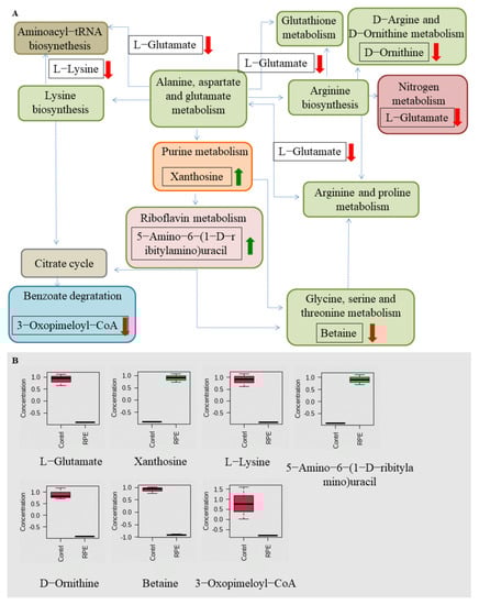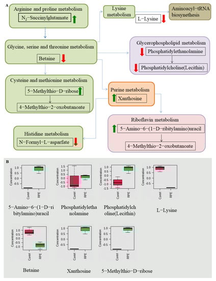 Related metabolic pathways and metabolites with significant changes involved after treatment with RPE treated on MRSA compared to the untreated group. (A) Green and red arrows indicate increase and decrease abundance of metabolites, respectively. Different colors in the pathway represent different types of metabolism, while the same color represents the same type of metabolism, e.g., green are all amino acid metabolism. (B) Box plots for metabolites with significant changes involved in related metabolic pathways.