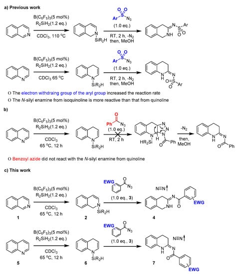 The development of synthetic pathways toward cyclic amidine derivatives is a research area of growing interest. Cyclic amidine derivatives have been shown to have interesting biological activities [1,2,3,4,5,6,7,8]; however, methods for their synthesis have several limitations [9,10,11]. Thus, several research groups have been developing synthetic methodologies for these derivatives [12,13]. Although most precedent pathways use cyclic amides as starting materials [11,12,13], our group recently reported a novel synthetic strategy that uses the readily available N-heteroarenes as starting materials and proceeds via a versatile N-silyl enamine intermediate (Scheme 1a) [14,15]. We achieved this intermediate through the B(C6F5)3 catalyzed dearomative hydrosilylation of N-heteroarene, which is considered an emerging area in organic synthesis [16,17,18,19]. In addition, although the reactivity of the first dearomative hydrosilylation has been widely reported [16,20], the reactivity of N-silyl enamine in the second [3 + 2] cycloaddition is relatively unexplored.