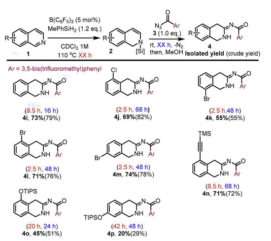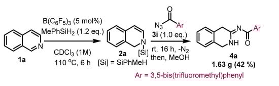 The reactivity of N-silyl enamine from isoquinoline 1a was found to be promising; thus, we began our study with isoquinoline [15]. Using the previously optimized conditions for the dearomative mono-hydrosilylation of 1a, we obtained the N-silyl enamine intermediate with good yield in a nuclear magnetic resonance (NMR) cell. The results from the following addition of acyl azides with different substituents are listed in Scheme 2. In contrast to the reaction of N-silyl enamine from quinoline [14], the N-silyl enamine 2a from 1a reacted with benzoyl azide 3a to produce the acyl amidine product 4a with a reasonable crude yield in 48 h. Acyl azides with halogen substituents (3b–3d) also worked well with N-silyl enamine 2a to achieve cyclic acyl amidines 4b–4d. However, the electron-rich azide 3e was less reactive than the electron-poor azides 3b–3d, which is consistent with our previous reports on sulfonyl azides [14,15]. We therefore examined more electron-poor azides (3f–3i) with nitro or trifluoromethyl substituents to improve the reactivity of acyl azides (4f–4i). Indeed, the strong electron-withdrawing substituents improved the reactivity of acyl azides. However, the acyl amidine products 4f–4h were relatively unstable due to hydrolysis during the work-up and purification process. Therefore, the 3,5-bis(trifluoromethyl)benzoyl azide 3i was considered to be the appropriate acyl azide to achieve the stable amidine product 4i. Notably, the conversion of 3i to 4i was achieved within a short timeframe of 16 h. We also confirmed the (Z) configuration of N-acyl amidine using an X-ray diffraction analysis of a single crystal of 4i (CCDC 2142037).