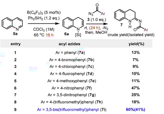 Next, we surveyed the reactivity of various acyl azides 3 for the N-silyl enamine 6a from quinoline 5a (Scheme 4). Although the reactivity of 6a was not sufficient for benzoyl azide 3a in 2 h [14], the cyclic acyl amidine 7a was obtained within 24 h; however, the yield was low, at 13%. Meanwhile, from the screening of acyl azides 3b–3i with different electronic natures, acyl azides with 4-nitro (3f) and 3,5-bis(trifluoromethyl) (3i) were effective toward 6a, leading to a moderate to good yield of the cyclic amidines 7f and 7i, respectively. Acyl azides with a strong electron-withdrawing 3,5-dinitro substituent (3g) were converted efficiently to N-silyl enamine 6a; however, the resulting acyl amidine 7g was unstable under ambient conditions. Relatively poor electron-withdrawing (3b–3d and 3h) and electron-donating 3e acyl azides were unable to convert 6a to cyclic amidines 7 with reasonable yields. Therefore, the acyl azide 3i was considered the most appropriate acyl azide for the synthesis of 7 from 5a via Scheme 4. In addition, the N-silyl enamine 6a, which was unreactive toward benzoyl azide 3a can now be utilized for the synthesis of acyl amidines 7.