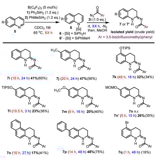 We investigated the substrate scope of quinolines 5 using the optimized acyl azide 3i (Scheme 5). First, an N-silyl enamine 6 from 5 was produced with diphenylsilane (Ph2SiH2) [14]. The reactions of the electron rich N-silyl enamines (6j–6p) and electron-poor azide 3i resulted in cyclic acyl amidines (7j–7p) with low to moderate yields. The N-silyl enamines with electron-donating substituents (6j–6p) were sufficiently reactive in the [3 + 2] cycloaddition step; however, the conversions in the first hydrosilylation step were relatively slow. Especially, the 6-methoxymethyloxyquinoline 5n was not converted to 6n with Ph2SiH2. Therefore, we decided to use the more reactive methylphenylsilane (MePhSiH2) for conversion in the first hydrosilylation of 5n to achieve N-silyl enamine 6n’ with reasonable yield [15]. An isolable amount of acyl amidine 7n′ was subsequently obtained. We note that the acyl azide 3i was, however, ineffective toward other N-silyl enamines with an electron-withdrawing group. For example, the cycloaddition of 3i and bromo substituted N-silyl enamine 6q was not accomplished due to the low reactivity of 6q toward the cycloaddition step.