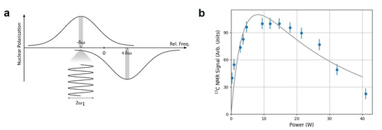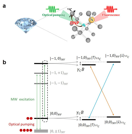 Dynamic nuclear polarization (DNP) is a technological breakthrough, which can significantly boost the signal-to-noise ratio in nuclear magnetic resonance (NMR) and magnetic resonance imaging (MRI) [1,2,3,4,5,6,7]. Enhanced signal enables extracting substantial amount of information at molecular resolution for a wide range of chemical, biological and physical processes [8,9,10,11,12,13,14,15,16]. Nevertheless, the high cost of conventional DNP instrumentation, based on helium cryogenics and strong magnetic fields, encourages the development of novel DNP techniques. Recently, optical dynamic nuclear polarization has been demonstrated, in which electronic polarization of negatively charged nitrogen-vacancy (NV) centers is transferred to bulk C nuclear spins in diamonds (Figure 1a) [17,18,19,20,21,22,23,24,25]. In addition to continuous and simultaneous irradiations of microwave and pump laser, a variety of techniques have been introduced, which include pulsed irradiation of microwave (MW) fields satisfying Hartman–Hahn condition [26], the cross polarization at the level anti-crossing in the ground state [17] and the excited state [18]. For nanodiamonds having significant line broadening due to their random orientation, frequency-swept microwave irradiation [21,22,23,24] has been applied. Hyperpolarization of C nuclear spins in diamond may open up new applications in quantum metrology, e.g., a high-field magnetometer [27,28] and a solid-state nuclear spin gyroscope [29]. Moreover, hyperpolarized nanodiamonds have a potential application in molecule-targeted in vivo imaging with the advantage of long spin life times [30,31,32,33,34].