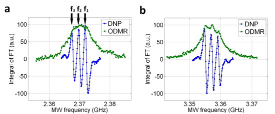 The investigation of the C polarization spectrum reveals us the triple structure (Figure 2). Varying the frequency of MW irradiation for optical DNP allows us to record the C NMR signal as represented by the blue lines. The green lines illustrate optically-detected magnetic resonance (ODMR) lines of NV center, including the transitions of m = 0 → m = −1 (Figure 2a) and m = 0 → m = +1 (Figure 2b). All these measurements are performed through NV centers of ⟨111⟩ orientation, which is parallel with the direction of magnetic field. Each data point is averaged by 10 measurements. After each NMR scan, a series of 90 pulses are applied to deplete residual C polarization ensuring zero polarization for a next measurement. The triplet structures are clearly observed for both NV spin transitions. The N (I = 1) nuclear spin of the NV center splits the NV spin levels each into three hyperfine sublevels with an energy splitting of 2.16 MHz, and this explains the triplet shown in Figure 2. Although ODMR does not exhibit the N hyperfine splitting, it is clearly visible in the C polarization spectra. Notably, the signs of the C polarization are identical for both NV spin transitions.