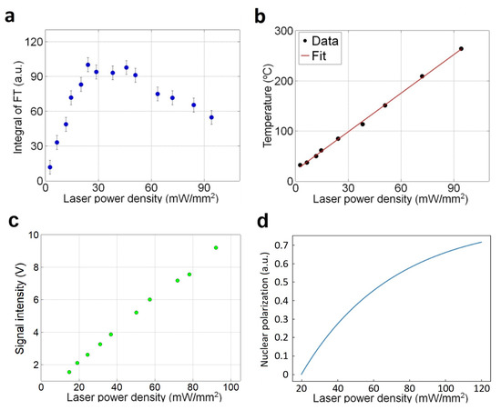 (a) The (normalized) C polarization obtained through optical DNP is measured as a function of laser power density. (b) The variation of diamond’s temperature with increasing the laser power density. (c) Fluorescence intensity of NV centers in diamond increases linearly with the laser power density. (d) The curve of the C polarization expected by using the results in Figure 4b,c.
