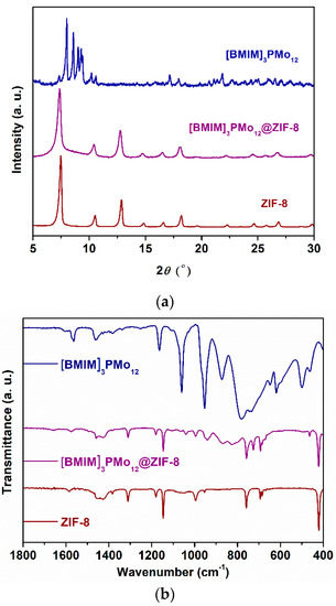 PXRD patterns (a) and FT-IR spectra (b) recorded for the pristine ZIF-8 compound and composite [BMIM]3PMo12@ZIF-8.