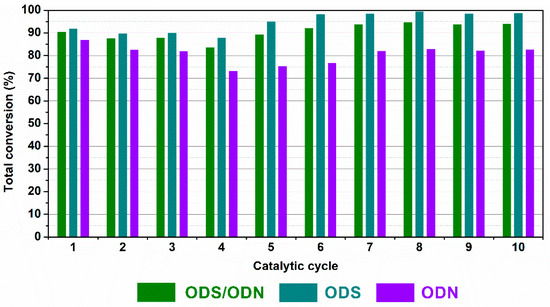 The heterogeneous [BMIM]3PMo12@ZIF-8 catalyst and the ionic liquid extraction phase ([BMIM]PF6) were reused for ten consecutive combined ODS/ODN cycles (Figure 4). This procedure allowed the sustainability and increased the cost-efficiency of the fuel treatment process. It is possible to observe that the combined ODS/ODN efficiency is maintained or even slightly increased after the fifth cycle. This increases after the fifth cycle is promoted by the increases of ODS. In fact, a near total desulfurization of the model fuel was observed from the fifth to the tenth cycle (always higher than 98.5%), in detriment of denitrogenation (which stabilizes around 82%). Therefore, these results confirm the potential of the reutilization of the [BMIM]3PMo12@ZIF-8/[BMIM]PF6 system combining the ODS and the ODN processes. Recently, our research group used a heterogeneous catalyst having the phosphomolybdic acid (H3PMo12) as an active center immobilized into porous MOF-808 support (H3PMo12@MOF-808) [30]. Similar results were obtained for simultaneous ODS and ODN processes (near complete desulfurization and denitrogenation achieved after 1 h); however, using the H3PMo12@MOF-808 catalyst, this presented a loss of activity for the ODS process after the fourth cycle. The superior maintenance of activity in reusing ODS/ODN processes with [BMIM]3PMo12@ZIF-8 catalyst can be related to the structural properties of MOF support (pore and windows size and/or metal center nature). Other studies in the literature using PMo12@MOFs catalysts only performed a single ODS process, needing higher quantities of catalysts or using other less sustainable oxidants [13,42,43].