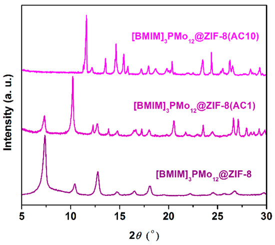 Powder XRD patterns of the [BMIM]3PMo12@ZIF-8 material before catalytic utilization, isolated after the 1st ([BMIM]3PMo12@ZIF-8(AC1)) and after the 10th catalytic cycle.