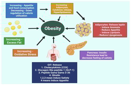 The most basic cause of obesity is either increased hunger or decreased calorie consumption due to controlling cellular functioning, physical activity, and other aspects of a person’s life (Figure 1). The accumulation of excess adipocytes leads to increased cytokine production, resulting in the development of vascular tissues. Hyperlipidemia, cardiovascular irregularities, and atherosclerosis all go hand in hand when it comes to consequences. Atherosclerosis contributes to obesity because obese people are at an increased risk of numerous ailments, such as colorectal cancer, gallstones, liver and gut disease, etc. Because of this, managing obesity is a highly effective strategy for preventing and dealing with these co-morbidities. Reducing appetite or increasing calorie expenditure can help to control weight. Hormones and receptors responsible for hunger and satiety regulate the appetite. Reduced sitting time can also reduce white adipose tissue buildup. By using these measures, people can assist with preventing obesity and its repercussions [25].