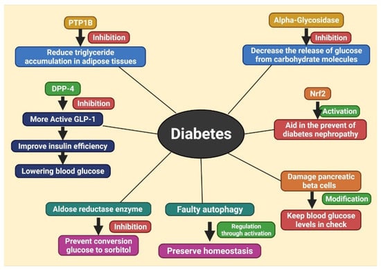 Hyperglycemia, which is brought about by an absence of insulin discharge as insulin advancement, is an indication of diabetes [39]. Cardiovascular tainting, retinopathy, neuropathy, nephropathy, and diabetic foot affliction could all be treated with hyperglycemia movement [40]. Diabetes can be achieved by a variety of factors. Autoimmunity, for example, can hurt pancreatic cells, achieving insulin deficiency. Insulin resistance can be achieved by bizarre insulin affirmation. Along these lines, signal transduction in insulin flagging is weakened, bringing about hyperglycemia. Numerous diabetic individuals have both of these physiological defects. Be that as it may, the essential etiology of hyperglycemia remains uncertain. Diabetes is divided into several types, with type 1 and type 2 being the most common. Type 1 diabetes (T1DM) is caused by the nutrition system’s destruction of cells, which results in a lack of insulin production. Only roughly 5–10% of diabetics are affected by T1DM. Insulin obstruction and powerlessness to react suitably to hyperglycemia cause T2DM. T2DM influences by far most diabetics (90–95%). A few diabetics can handle their blood glucose levels with exercise, a smart dieting design, and an oral glucose-lowering remedy, contingent upon their condition. These diabetic patients do not need insulin from an outside source to live. Those with serious cell harm, then again, cannot handle their blood glucose levels by fundamental action and sustenance. They need consistent insulin imbuements to remain alive [39]. T2DM treatment is constantly in development. Metformin [41] is the most regularly utilized prescription for T2DM. Metformin diminishes hepatic glucose creation and plasma insulin levels while likewise further developing insulin affectability in patients with fringe issues, considering expanded glucose maintenance [42]. Metformin is a hypoglycemic medication that helps T2DM patients live longer. Metformin was originally developed from herbal compounds found in the plant Galega officinalis. Metformin has various incidental effects, including sickness, swelling, and flatulating. Other diabetes medications have been developed, yet none are as successful or convincing as metformin [41]. Adjusting one’s way of life is another type of diabetes treatment. In some situations, lifestyle adjustments are preferable to medications. As part of a way-of-life intervention, a low-calorie, low-fat eating regimen is combined with at least 150 min of respectably concentrated exercise per week [43]. This proposes that phytogenic substances, as opposed to synthetically produced prescriptions, are possibly more appropriate for diabetic treatment.
