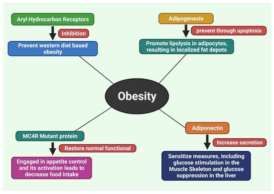 The secretion of fatty acids and triglycerides in the circulation results in the formation of fat cells all over the body, followed by atherosclerosis. These metabolic disorders may also arise as a result of this phenomenon. For the management of obesity, we must reduce circulation and stored fat levels. Additionally, as oxidative stress is a frequent element in some pathological disorders, such as obesity and other conditions, reducing oxidative stress can help to mitigate the susceptible repercussions of obesity and other difficulties. In addition to secreting the three substances, adipocytes secrete an adipocytokine, also known as lectin, adiponectin, and visfatin. Autophagy can be induced by adiponectin in the breast, colon, prostate, and female-specific carcinogenesis [26,27,28]. Therefore, adiponectin suppression would be helpful in the prevention of obesity-related carcinogenesis. Hormones such as epinephrine, norepinephrine, and cortisol increase the release of insulin, which regulates blood glucose levels and controls body fat. As a result, any single part of this basic physiological sequence is unbalanced, which causes obesity. Insulin has an important role in managing obesity and is associated with diabetes [4,25].