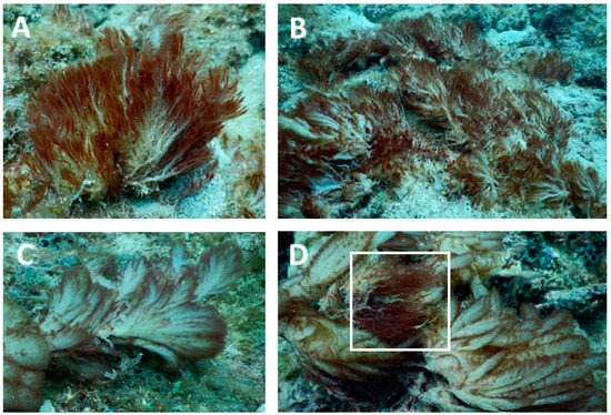 Underwater photographs of Caldora sp. in comparison to Caldora penicillata on the reef near Fort Lauderdale, FL. (A,B) Macroscopic photographs of tufts of Caldora sp. Note the distinct morphology of Caldora sp., as the filaments are intertwined giving it a “stringy” appearance. (C) Caldora penicillata [10]. (D) The two species can also grow together, and the white box shows Caldora sp. as it overgrows Caldora penicillata.