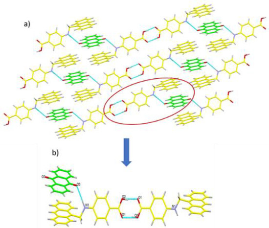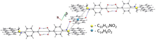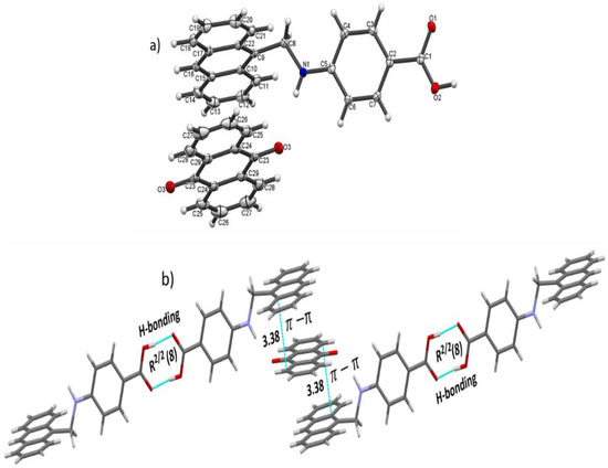 Single-crystal X-ray structure analysis revealed that L3 crystallizes in the triclinic system with the P-1 space group (Table 1). The ORTEP view of the complex illustrates the coexistence of both anthraquinone and L2 ligand in the D–A complex (Figure 1a). The crystal structure also exposes that there is inter as well as intramolecular H-bonding between N1–O3 and O2–O1 of one L2 molecule to another L2 molecule (Figure 2). The interatomic distance between N1–O3 was found to be 2.98 Å; furthermore, the dihedral between the two planes of the L2 moiety and the anthraquinone moiety was 14.064(12). The torsional angle between the Caryl-CH2-NH-Caryl of the L2 moiety was found to be 175.9(2°). The extension of the asymmetric unit via short contacts have elaborated the π–π stacking between the rings of anthraquinone and ligand (L2) along with H-bonding between the carboxylic groups of moieties to the other (Figure 1b), which confirms the interaction between the acceptor and donor molecule. The bond lengths, bond angles and other parameters are provided in Supplementary Materials, Tables S1–S5.