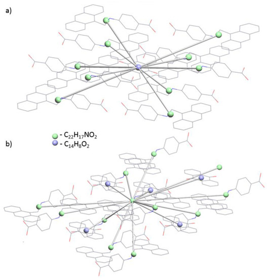 (a) C14H8O2 (top) and (b) C22H17NO2 (bottom) molecular environments that are determined in the underlying net in the standard representation of the Coulomb or vdW-bonded molecular structure of L3. Hydrogen atoms were omitted for clarity.