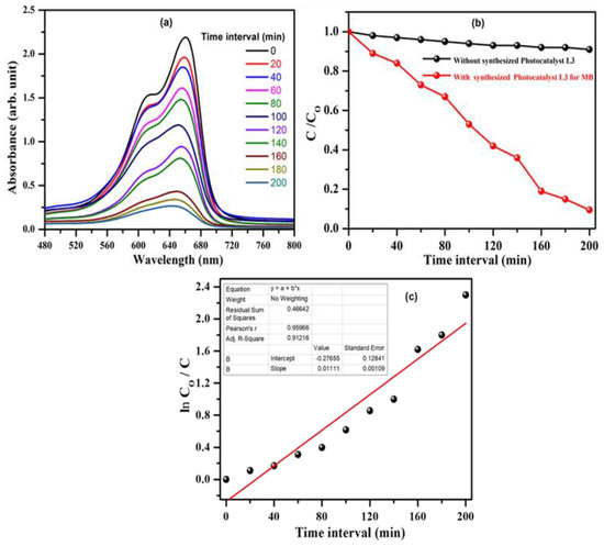 To determine the photocatalytic activity of the as-synthesized complex (L3), we successfully monitored dye degradation for MB, a cationic dye, at ambient temperature. The photocatalytic experiment was performed in the Pyrex flask reactor under light illumination using a xenon arc lamp. For an efficient dye-degradation reaction, an appropriate amount (100 mg) of synthesized complex (L3) was added into a 250 mL MB dye solution of 20 ppm strength. Before the illumination of light, the aqueous suspension of MB dye with the photocatalyst (complex L3) was set to continuous stirring for 60 min to develop adsorption–desorption equilibrium in the dark. Afterwards, the suspension of stable dye was illuminated by UV light. Then, we measured the decomposed dye’s absorption behavior periodically every 20 min by a UV–Visible spectrophotometer (PerkinElmer Model 750, Shelton, CT, USA). With the equation