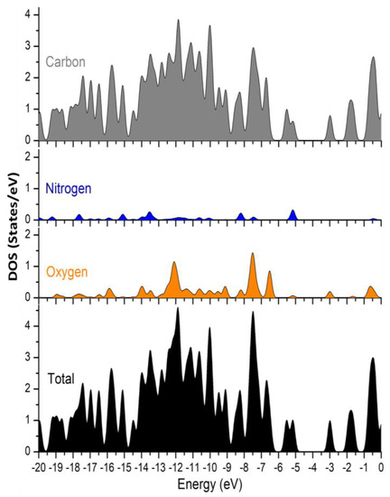 Using band-structure calculations, we can easily explain the photocatalytic activity involved with L3. We plotted DOS and p-DOS graphs of L3 with the help of DFT calculations (Figure 8). The results obtained indicated that aromatic O, N and C centers have an important role in contributing to their VB (valence band). The maximum contribution is due to the carbon and oxygen atoms, which suggests that electrons can be transferred from the moiety of L3 to another moiety of L3 involving C and O atoms. As an outcome, the DOS and p-DOS data show that the electronic transition in L3 is primarily of the ligand–ligand type. When light falls on L3, electrons from VB are transferred to CB, leaving equivalent amounts of holes in VB. The moisture in the process can interact with these holes to create •OH radicals, which can break the MB dye. The electrons in the CB, on the other hand, combine with the molecular oxygen superoxide radical that is highly reactive and degrades the organic dye substantially. Less band-gap energy is attributed to photocatalytic efficiency with easier electron promotion from VB to CB, resulting in a higher number of holes being formed in the VB, which are accountable for greater numbers of •OH radicals being produced in their VBs. The higher the number of electrons in the CB, the more superoxide radicals are generated. As previously described in the literature, the •O2− and •OH radicals are responsible for organic pollutant photodegradation in substances such as MB dye [35].