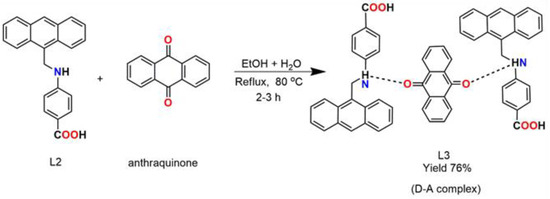 In recent years, several attempts have been made regarding the synthesis of charge transfer (CT) complexes due to their structural applications in different branches of chemistry including organic semiconductors [1,2], photocatalysts [3], biological complexes [4,5,6], liquid crystals [7] and many more. Owing to their importance, since they can also act as an intermediate molecule or can have transitory existence in some important chemical reactions, efforts have been made by scientists to understand their synthetic applications. The most important aspect of CT complexes is their intermolecular interactions in the field of coordination and supramolecular chemistry. The existence of hydrogen bonding and non-covalent interactions make them obtain more attention in the emerging field of supramolecular chemistry [8,9]. Donor–acceptor molecular systems are also parts of these kinds of systems, and in this respect, we have synthesized a new donor–acceptor system (L3) by synthesizing our own ligand (L2) [10] as donor and anthraquinone as an acceptor molecule. Anthraquinone has been an important chemical for pharmaceutical preparations [11]. The reason anthraquinone is biologically active is the presence of the quinone system [12,13]. In most of the cases of CT complexes with an anthraquinone- or quinone-based system, the quinone moiety acts as an acceptor of electrons; this is the reason that they are in demand in redox chemistry [14,15]. Experimental data were justified with DFT/TD-DFT B3LYP/6-311++G(d,p) (basis set) theoretical calculations to obtain chemical, structural, spectroscopic, thermodynamic and vibrational phenomena of the complex L3. Until now, the CT complexes of anthraquinone had been less explored. We have successfully synthesized a novel CT complex of anthraquinone with our own synthesized ligand L2.