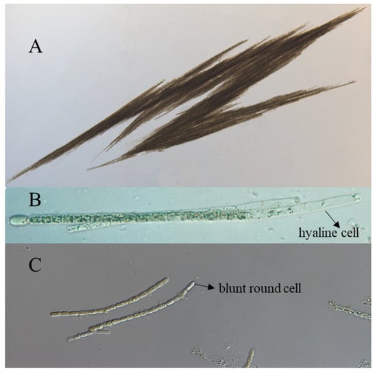 Morphological characteristics of the two different filamentous cyanobacteria. (A) outside sample of Aphanizomeon flos-aquae; (B) Aph. flos-aquae had fascicle-like assemblages with elongated and hyaline terminal cells. (C) Aph. gracile, blunt round terminal cells characters.