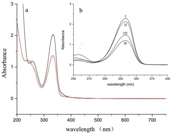 Full-wavelength scanning of the extraction of M. aeruginosa PCC7806 and Aph. flos-aquae CHAB5921 dry alga powder. (a) UV-Vis absorption spectrum of the methanolic extraction of PCC7806 (black line) and CHAB5921 (red line) strains. Both have the same absorption at 334 nm. (b) Collecting the two fractions of the strain PCC7806 and CHAB5921. Both showed the same absorption at 334 nm. Line I: 7806-Shinorine; Line II: 5921-Shinorine; Line III: 5921-Porphyra-334; Line IV: 7806-Porphyra-334.