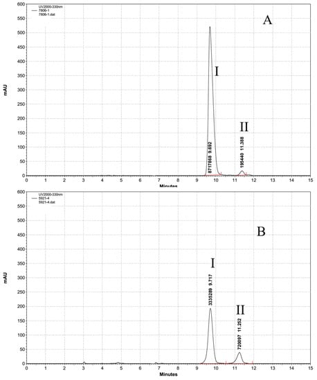 HPLC chromatography analysis of the purified MAAs of two strains. Both M aeruginosa PCC7806 (A) and Aph. flos-aquae CHAB5921 (B) extraction showed the same two characteristic peaks at 9.7 min and 11.3 min. I: shinorine content, II: porphyra-334 content.