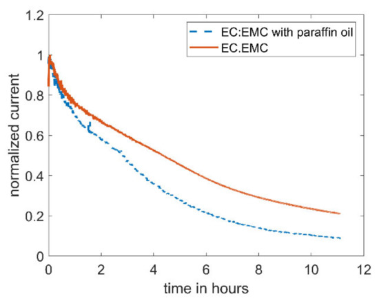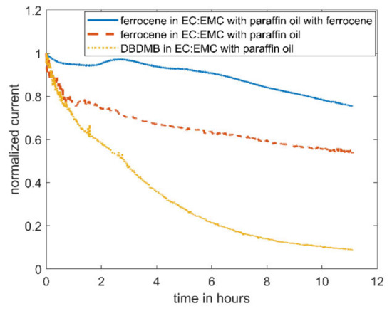 As an alternative redox mediator, the stability of ferrocene was analyzed in the EC:EMC-based electrolyte. Ferrocene is known to be a relatively stable metal complex [29]. It is active at lower voltages (3.4 V vs. Li, see Figure 4) than DBDMB (4.1 V vs. Li, see Figure 4). Therefore, the potential lies within the electrochemical window of most of the alkyl carbonate electrolytes. Both redox mediators show a plateau at higher potentials than their oxidation potentials, indicating the presence of a diffusion-controlled bulk current. Figure 5 shows the results for the amperometry measurements of ferrocene in EC:EMC. The use of ferrocene leads to a significantly more constant current compared to DMDMB, only dropping by approximately 45% in eleven hours. The paraffin oil shield turned yellow during the measurement, indicating a partial solution of ferrocene in the oil. This reduces the concentration of the redox mediator in the electrolyte, resulting in a lower current. The liquid–liquid extraction of ferrocene from the electrolyte into the covering paraffin oil was prevented by adding ferrocene to the oil. The required concentration was calculated using UV–vis spectroscopy data. With the addition of ferrocene to the paraffin oil, the current was further stabilized, only decreasing by 25% within eleven hours. In a two-electrode setup without the lithium reference electrode, the current decreased even further. The current only dropped by approximately 5% within eleven hours. From this, it can be concluded that ferrocene is stable within detectable limits even in linear carbonate-based electrolytes. With a similar oxidation voltage to DBDMB, it is a very suitable redox mediator for SECM experiments on LIBs and corresponding battery materials.