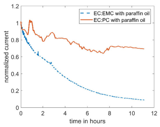 When replacing the linear carbonate, EMC, with the cyclic carbonate, PC, the decrease in current can be reduced (see Figure 3). The current in the electrolyte utilizing PC as co-solvent only drops by ~30%, compared to 90% with EMC as co-solvent.